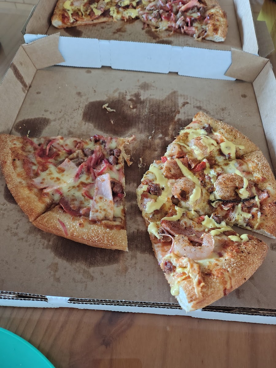 The most topped pizza! Beef, bacon, pepperoni, cabana, ham, chicken, capsicum, red onion, pineapple, and olives in house-made tomato sugo sauce, topped with mixed herbs and a swirl of garlic aioli sauce.